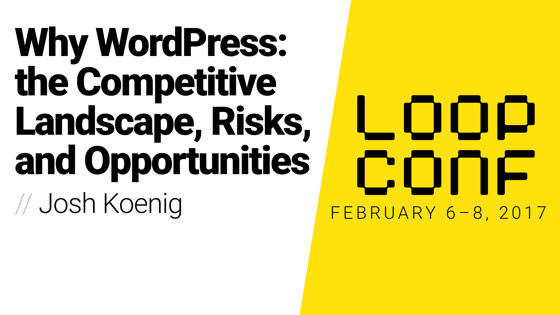 2017 – Why WordPress the Competitive Landscape, Risks, and Opportunities – Josh Koenig Published June 10, 2022 at 1920 × 1080 in 2017 – Why WordPress the Competitive Landscape, Risks, and Opportunities – Josh Koenig ← Previous Next →